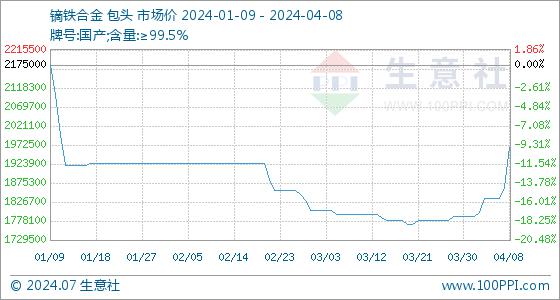 4月8日,生意社镝铁合金基准价为1865000.00元/吨,与本月初(1790000.00元/吨)相比,上涨了4.19%。
