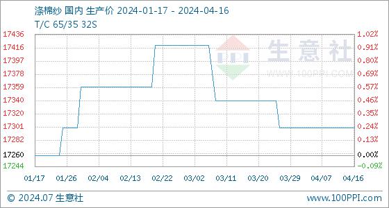 4月16日,生意社涤棉纱基准价为17300.00元/吨,与本月初持平。