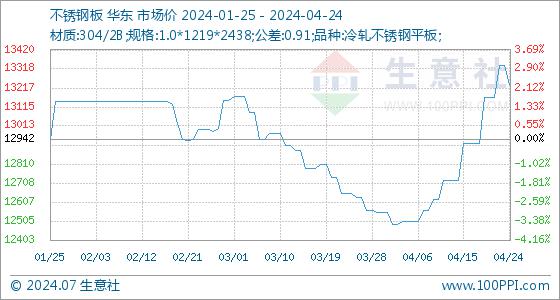 4月24日生意社不锈钢板基准价为13335.71元/吨