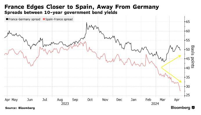 更值得注意的是,与信用评分较低的西班牙、意大利和葡萄牙国债相比,法国国债表现不佳。与法国相比,西班牙的额外借款成本在过去六个月里几乎减半。