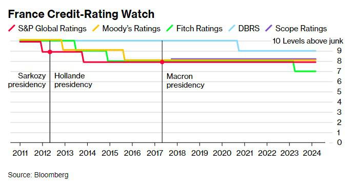 数月来,评级公司一直在警告法国信用评估存在风险。惠誉一年前下调了该国的评级,并于去年10月发布了另一份谨慎的报告,称债务的大幅持续增长可能会引发进一步的负面行动。摩根大通和德国商业银行认为,该机构本周有可能将法国前景下调至负面。
