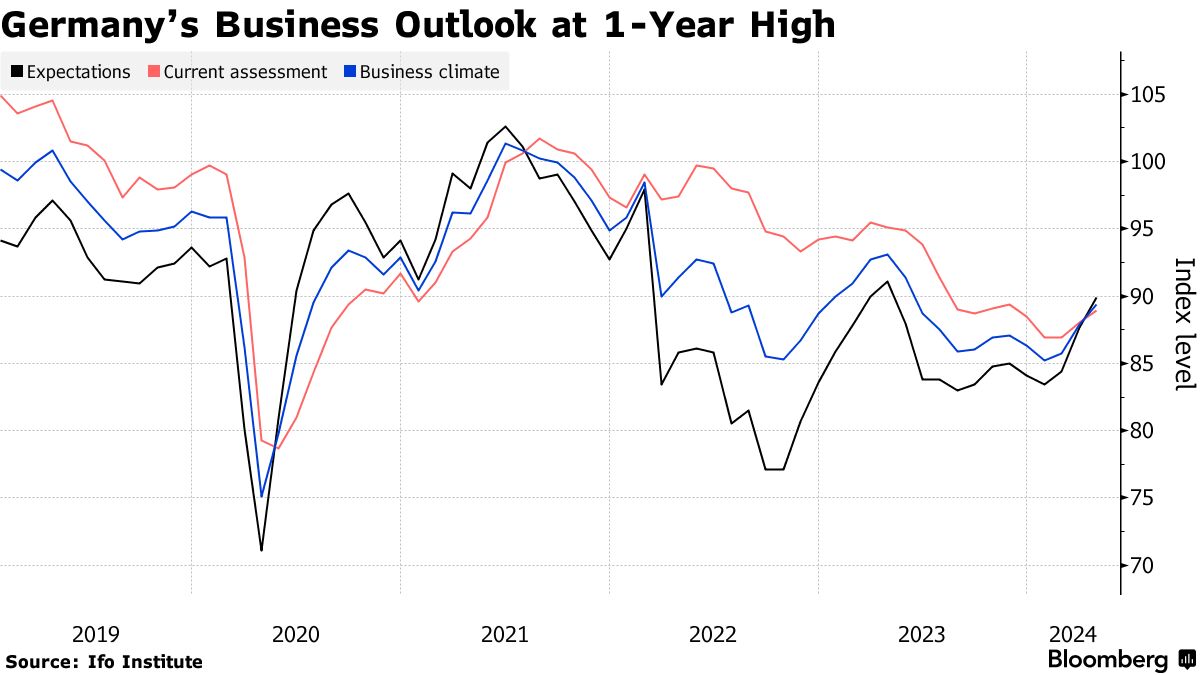 全球经济韧性和欧元区货币政策放松的前景,正在帮助德国走出自俄乌冲突后陷入的经济困境。欧洲央行行长拉加德(Christine Lagarde)在上周表示,德国可能已经“扭转了局面”,而德国总理朔尔茨(Olaf Scholz)也表达了相对乐观的情绪,称德国就业创纪录,通胀明显回落。