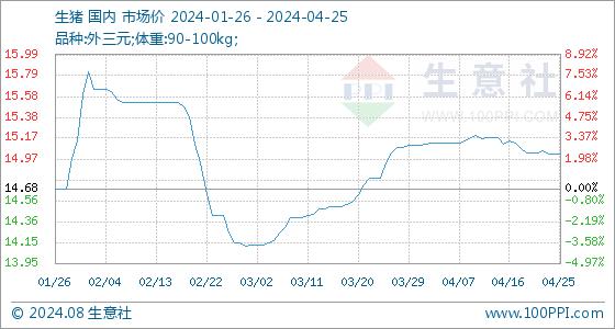 4月25日,生意社生猪基准价为15.02元/公斤,与本月初(15.10元/公斤)相比,下降了-0.53%。