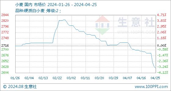 4月25日,生意社小麦基准价为2630.00元/吨,与本月初(2720.00元/吨)相比,下降了-3.31%。