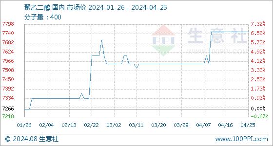 4月25日,生意社聚乙二醇基准价为7750.00元/吨,与本月初(7550.00元/吨)相比,上涨了2.65%。