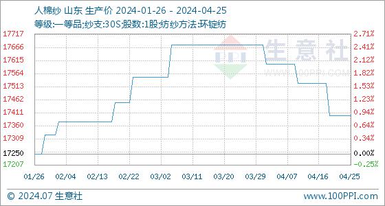 4月25日,生意社人棉纱基准价为17400.00元/吨,与本月初(17675.00元/吨)相比,下降了-1.56%。