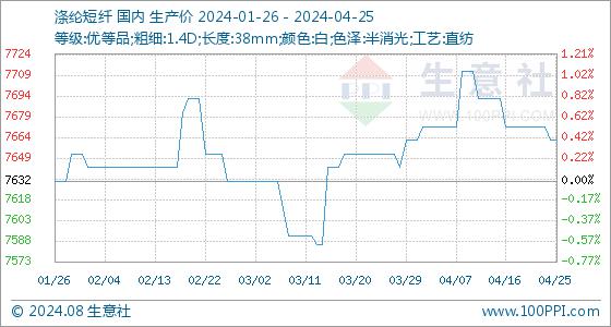 4月25日,生意社涤纶短纤基准价为7662.00元/吨,与本月初持平。