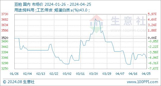4月25日,生意社豆粕基准价为3374.00元/吨,与本月初(3486.00元/吨)相比,下降了-3.21%。