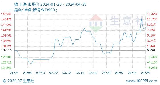 4月25日,生意社镍基准价为142050.00元/吨,与本月初(131466.67元/吨)相比,上涨了8.05%。