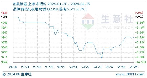 4月25日,生意社热轧板卷基准价为3900.00元/吨,与本月初(3748.00元/吨)相比,上涨了4.06%。