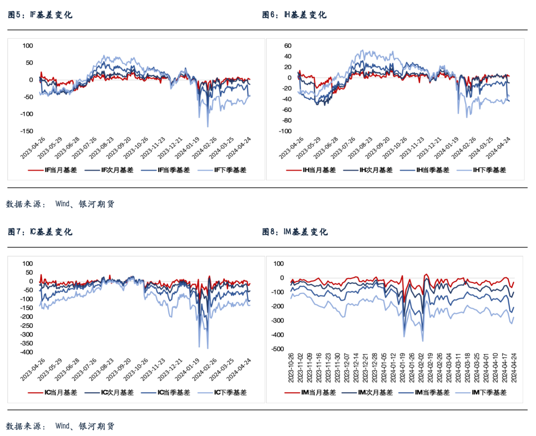 股指期货随现货反弹,至收盘,主力成交合约IH2405涨0.35%,IF2405涨0.42%,IC2405涨1.2%,IM2405涨2.3%。基差表现分化,IF和IH升水小幅回落,IC和IM贴水略有收敛,特别是当月合约收敛明显。IC、IF和IH成交分别下降14.2%、11.4%和7.2%,IM成交增加13%。IC、IF和IH持仓分别下降2.9%、0.2%和2.4%,IM持仓增加1.2%。