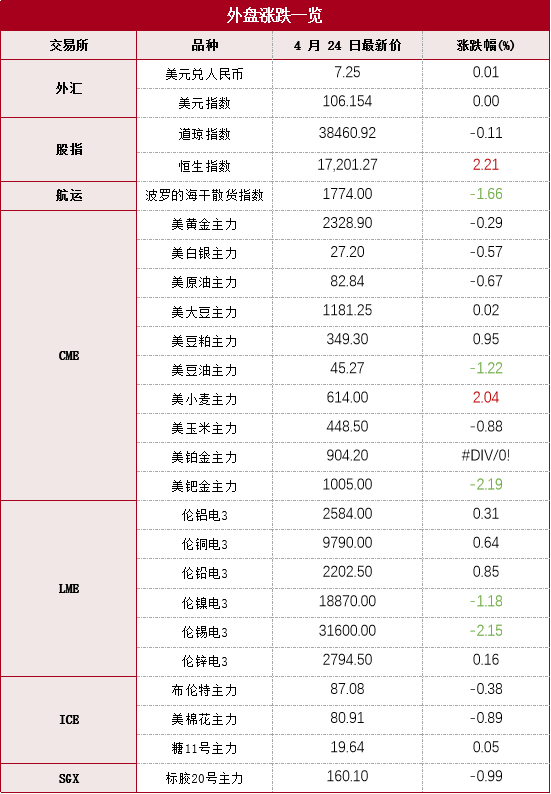 隔夜,LME铜收涨62美元,涨幅0.64%,LME铝收涨8美元,涨幅0.31%,LME锌收涨4美元,涨幅0.16%,LME镍收跌225美元,跌幅1.18%,LME锡收跌695美元,跌幅2.15%,LME铅收涨18美元,涨幅0.85%。消息面:欧元区4月制造业PMI初值45.6,预期46.6,3月终值46.1。美国上周初请失业金人数为21.2万人,预期21.5万人。国际镍业研究组织预计,2024年全球镍产量将增至355万吨,2023年为336万吨;全球镍需求将增至345万吨,2023年为319万吨。赞比亚矿业商会透露,国家电力公司计划削减对矿业公司的电力供应,降幅达20%。一季度中国主要发电企业电源工程完成投资1365亿元,同比增长7.7%,电网工程完成投资766亿元,增长14.7%。据SMM调研数据显示,3月全国铝水棒总产量150.8万吨,环比增速29.8%,同比增速15.5%。最新全国主流地区铜库存增0.02万吨至40.37万吨,国内电解铝社会库存减1.25万吨至83.15万吨,铝棒库存减1.17万吨至24.5万吨,七地锌锭库存减0.05万吨至21.77万吨。金属库存偏高,去库缓慢,现货升水短期低位。美元短期震荡攀升,欧洲降息或早于美国。国内铜冶炼厂计划减产,操作建议,金属短线交易为主,铜铝远期跨期正套可继续持有。