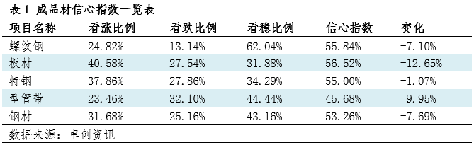 分品种来看,螺纹钢信心指数55.84,较上期指数降7.10;板材信心指数为56.52,较上期指数降12.65;特钢信心指数为55.00,较上期指数降1.07;型管带信心指数为45.68,较上期降9.95。
