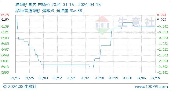 4月15日,生意社油菜籽基准价为6140.00元/吨,与本月初(6152.00元/吨)相比,下降了-0.20%。