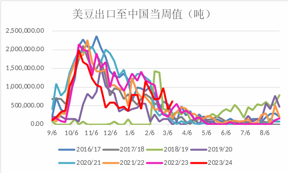 截止3月14日当周,美国2023/24年度出口总量为3549.52万吨,同比去年同期的4282.94万吨减少17.12%,其中出口至中国的大豆总量为2211.55万吨,同比去年同期的2867.6万吨减少22.88%。可以看出美国出口量无论是出口至中国还是总量均较去年同期缩减,原因其一是目前全球主要采购来源转向巴西,除了巴西豆有价格优势,还因今年大概率为丰年,供给较为充裕;第二是美国国内油粕消费不错,因此出口目标适当调低也为情理之中。
