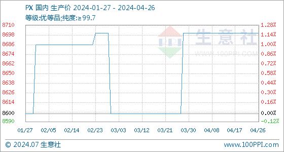 4月26日,生意社PX基准价为8700.00元/吨,与本月初持平。