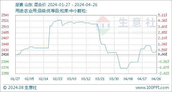 4月26日,生意社尿素基准价为2424.17元/吨,与本月初(2423.33元/吨)相比,上涨了0.03%。