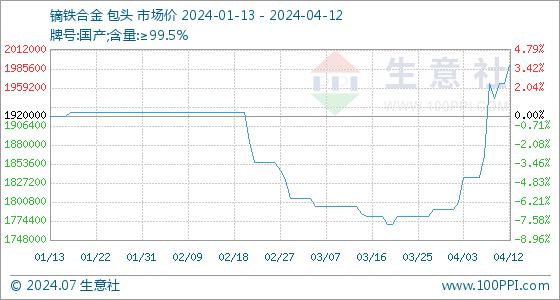 4月12日,生意社镝铁合金基准价为1965000.00元/吨,与本月初(1790000.00元/吨)相比,上涨了9.78%。