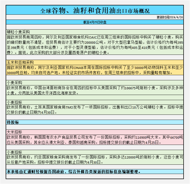 截至周四收盘,全球谷物、油籽和食用油出口市场招标、采购概况: