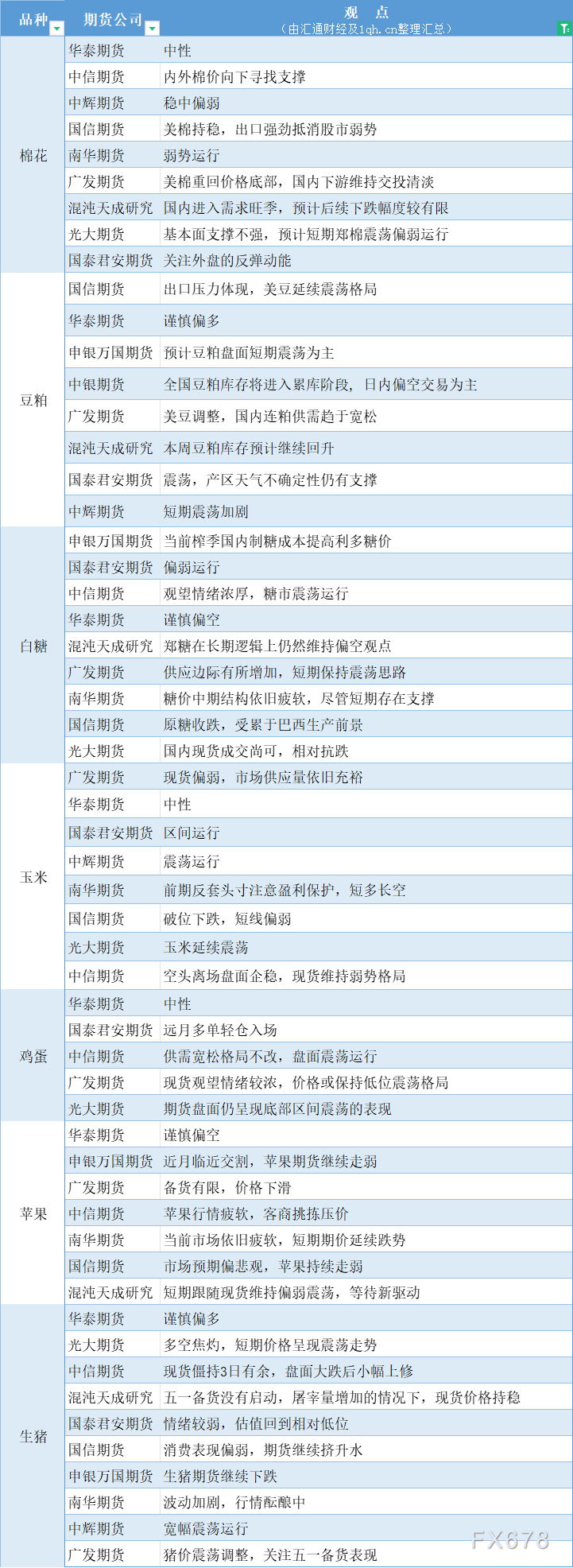 汇通财经APP讯——期货公司观点汇总一张图:4月26日农产品(棉花、豆粕、白糖、玉米、鸡蛋、生猪等)