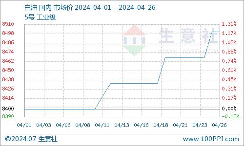 据生意社商品行情分析系统,截止4月26日白油市场均价在8500元/吨,4月1日白油市场均价在8400元/吨,价格较上月初上涨1.19%。