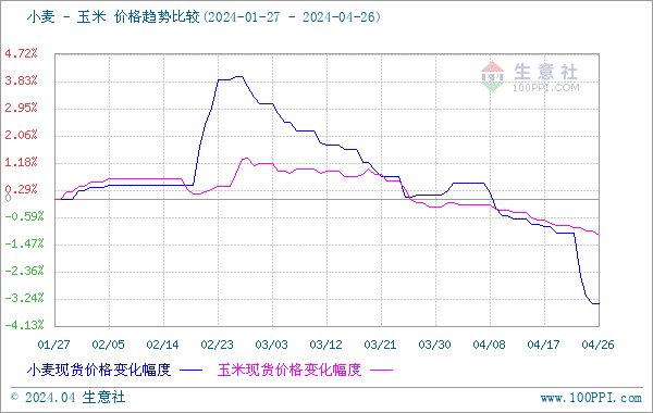 进入4月下旬,政策小麦持续出库,面粉下游需求持续低迷,制粉企业完成收购任务后持续下调小麦收购价格,加之临池玉米价格持续走低,存粮贸易主体出库变现意图增加,国内小麦市场供应依旧宽松,诸多利空压制下,国内小麦市场价格持续弱势下行。