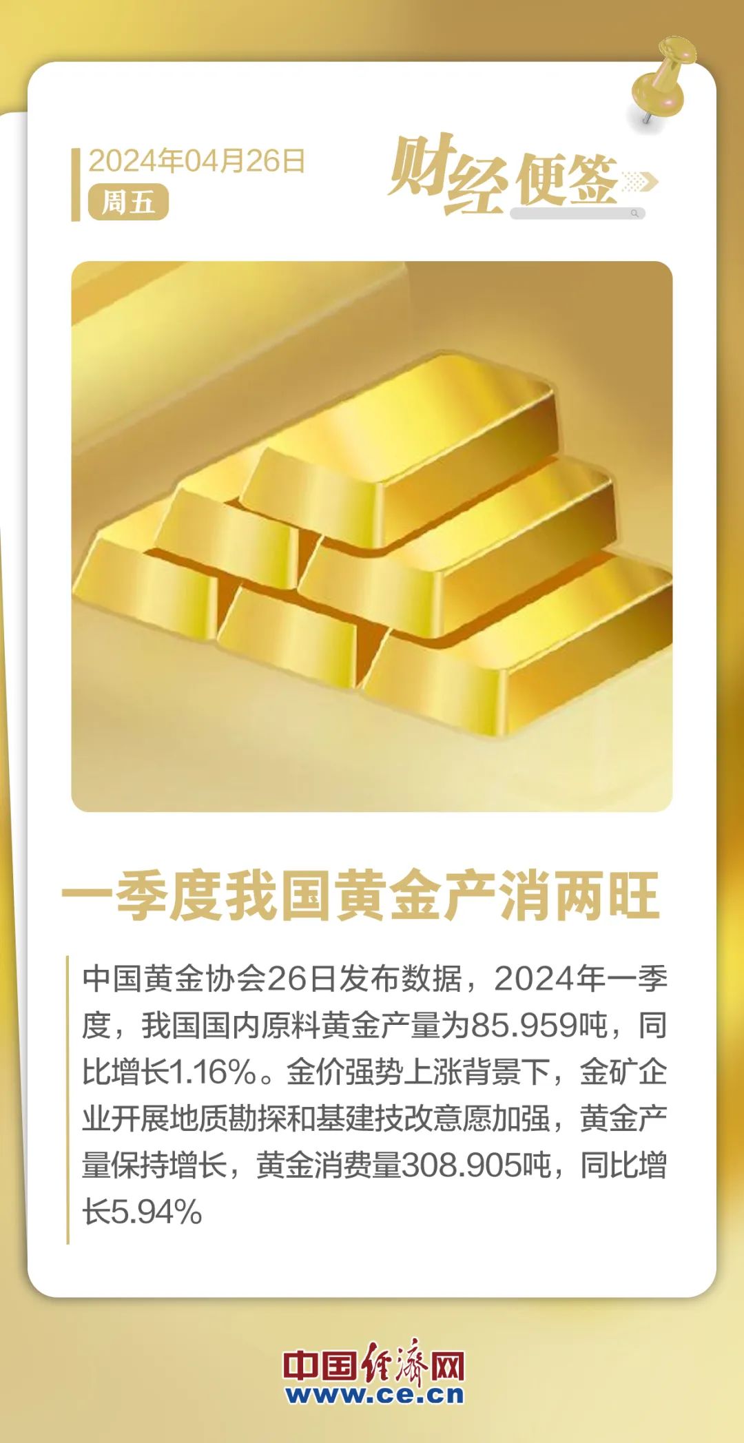 中国黄金协会26日发布数据,2024年一季度,我国国内原料黄金产量为85.959吨,同比增长1.16%。金价强势上涨背景下,金矿企业开展地质勘探和基建技改意愿加强,黄金产量保持增长,黄金消费量308.905吨,同比增长5.94%。