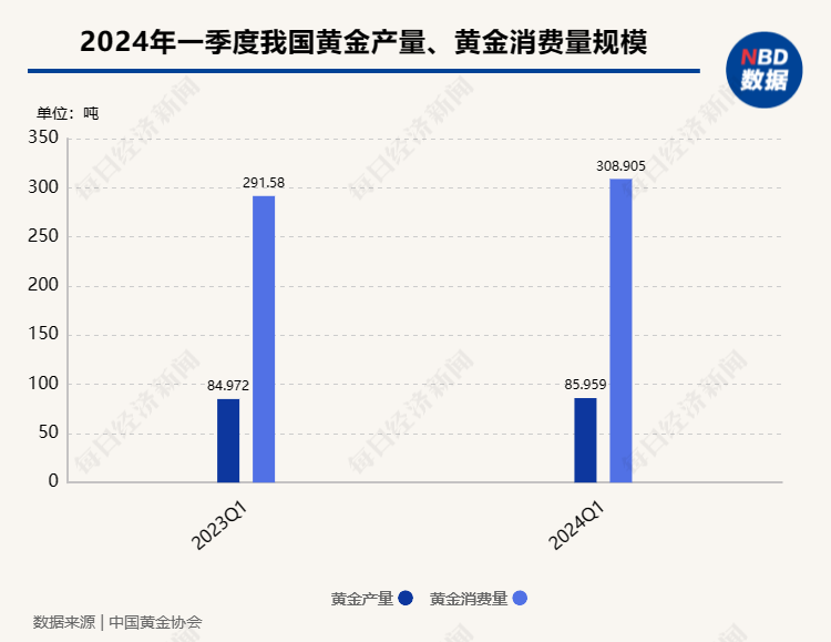 2024年一季度,我国原料黄金产量为85.959吨,与2023年同期相比增产0.987吨,同比增长1.16%,其中,黄金矿产金完成60.191吨,有色副产金完成25.768吨。据中国黄金协会工作人员介绍,因金矿企业盈利空间增加,有空间进一步降低入选品位,使得黄金产量进一步增长。黄金首饰消费“遇冷”,溢价较低的金条及金币受“热捧”
