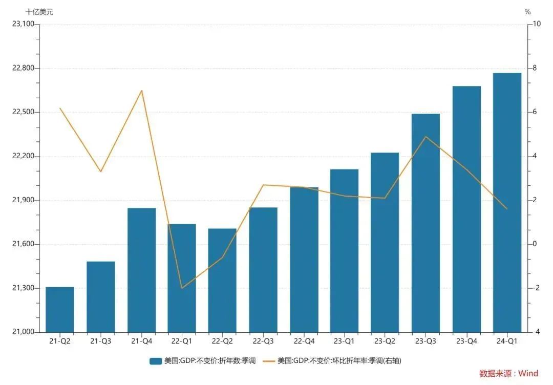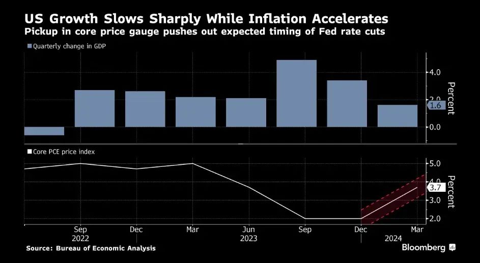 时间周四(4月25日),美国商务部发布的数据显示,2024年一季度国内生产总值(GDP)按年率计算增长1.6%,增幅较去年第四季度的3.4%明显收窄。作为经济增长引擎的个人支出增长2.5%,低于预期水平。
