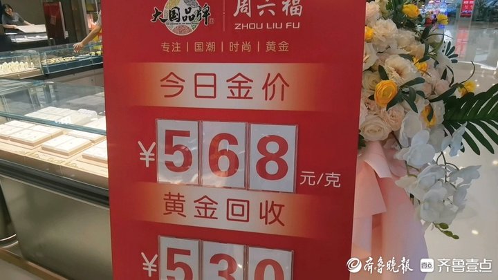 离开人民商场,记者又来到经四路万达广场。在中国黄金的柜台,店里醒目标志显示当天的金价588元每克,周六福的当天金价为568元每克。