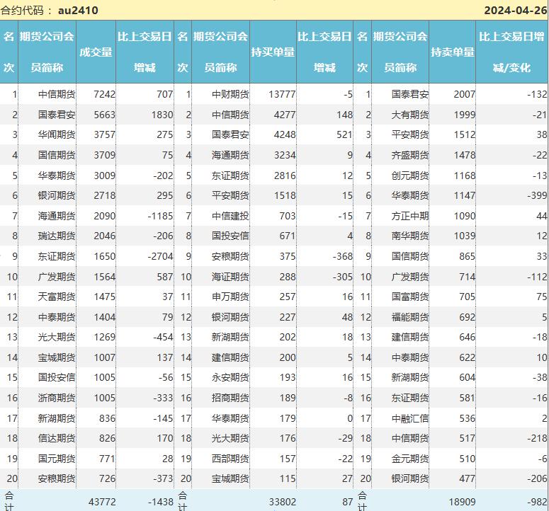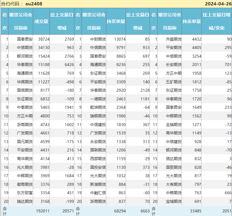 据上期所官网披露,截至4月26日,在黄金期货AU2408、AU2410、AU2412、AU2502、AU2504等多个合约多头持仓排名上,中财期货都高居第一,总计持有黄金期货多单达5.72万手,大幅领先包括多家头部期货公司在内的其他同行。以一手黄金期货对应一公斤黄金来看,5.72万手黄金期货就对应57吨黄金。