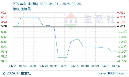 原料市场,部分PTA工厂装置重启,新产能产出合格品使PTA货源供应充足,行业开工小幅回升至81%以上。加之下游聚酯工厂多消耗库存及长约货源,补库意向较低,对PTA现货需求支撑一般。4月份PTA价格总体呈现弱势,截止4月26日国内华东地区市场均价在5940元/吨,较月初下跌0.89%。
