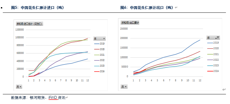 2024年3月花生仁进口8.7万,其中塞内加尔进口5.6万吨,美国带壳花生进口1.3万吨,1-3月累计进口花生仁10.2万吨,同比减少67.4%。3月出口花生仁1.4万吨,累计出口3.7万吨,同比增44%。