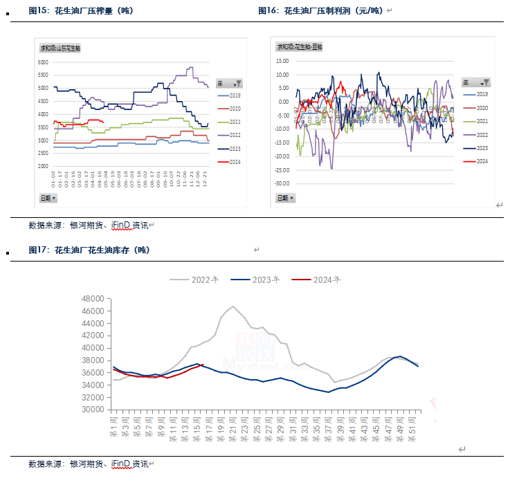 24年4月花生下游需求偏弱,花生产区通货米价格下调,油厂油料米价格上涨,通货与油料米价差缩小。进口花生环比增加较多,但仍远低于去年同期,进口苏丹米花生价格稳定,塞内加尔进口花生米价格上调。花生油厂花生仁库存持续增加,开机率上涨,花生油库存也缓慢增加。但下游需求仍偏弱,市场预期今年花生种植面积会增加,重心会下移。但5月仍会炒作天气,预计花生现货下跌幅度有限,10期货仍有炒作可能,预计花生10底部9000附近支撑较强。