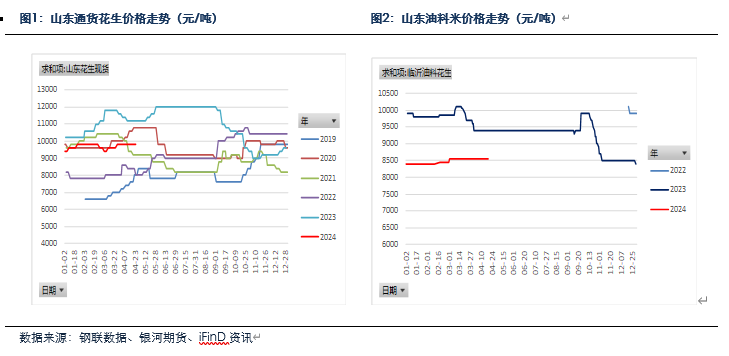 2023年全球花生产量5046万吨,中国产量1860万吨。中国花生1860万吨产量中,大约一半是食用,一半是榨油。2023年全球油脂第一大是棕榈,产量7946万吨,第二大是豆油,产量6168万吨,第三大是菜油,产量3379万吨,第四是葵花籽油,产量2166万吨,花生油产量614万吨。国内豆油消费1780万吨,菜油900万吨,棕榈605万吨,花生油326万吨,葵花籽油176万吨。花生油在国内消费比例较高,且花生油价格远高于其他主要油脂,花生的价格很大程度上取决于花生油厂的收购价格。第三部分国内花生基本面情况一、4月国内花生现货下跌,油料花生米上涨,价差缩小