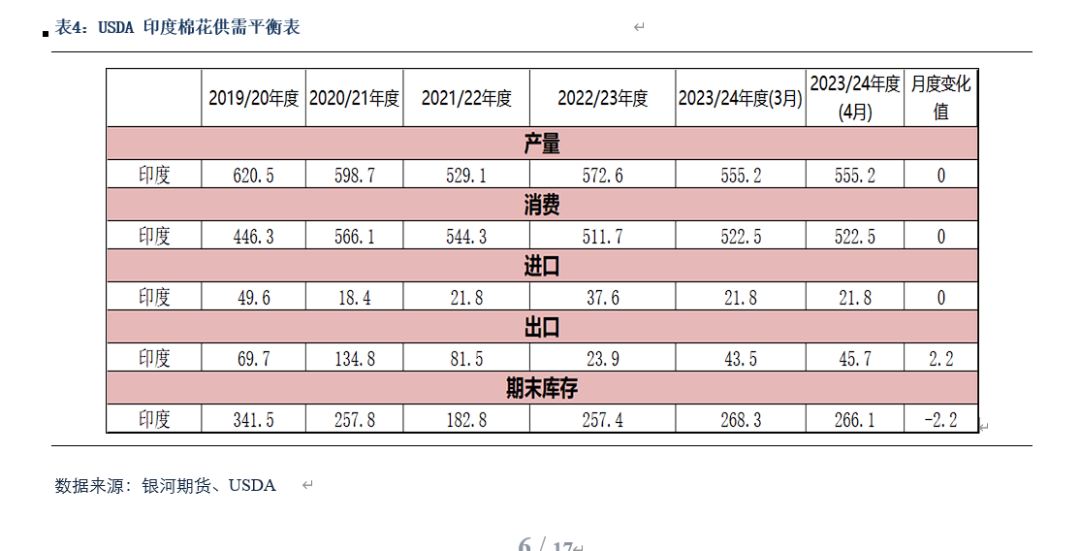 根据4月USDA最新产销预测报告显示,印度棉花23/24年度总产量继续维持555.20万吨、总消费维持522.5万吨、出口较上月相比调减2.2万吨至45.7万吨,期末库存较上月相比调减2.2万吨至266.1万吨。