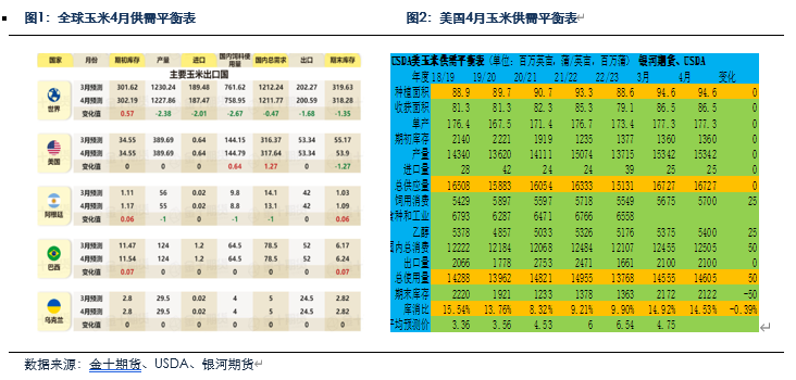 4月主产国产量保持稳定。其中美玉米种植面积9460万英亩,单产177.3蒲/英亩,产量为15342百万蒲,和上月持平,比去年高1627百万蒲,库存为2122百万蒲,低于上月50百万蒲,也高于去年同期的1363百万蒲。巴西产量124百万吨,和上月持平,也低于去年同期的137百万吨。巴西出口52百万吨,高和上月持平。阿根廷产量55百万吨,比上月低100万吨,高于去年同期的36百万吨,阿根廷出口42百万吨,和上月持平,但高于去年的25百万吨。乌克兰产量29.5百万吨,和3月持平,高于去年同期的27百万吨,出口24.5百万吨,和3月持平,低于去年的27百万吨。
