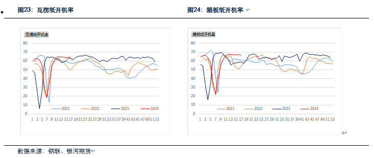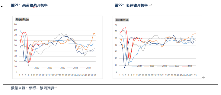 2024年4月开机率增加,淀粉库存大幅增加,淀粉厂利润继续下滑。截止4月24日,淀粉企业开机率65.76%,仍处于高位,深加工玉米库存为528.5万吨,同比去年减少3.61%,但黑龙江玉米库存161万吨,低于去年32.4%,山东玉米库存108.2万吨,高于去年111.7%。全国淀粉企业淀粉库存为125.6万吨,月增幅9.6%,年同比增幅29.1%。下游F55果葡糖浆开机率54.5%,麦芽糖50.7%,瓦楞纸开机率64.37%,箱板纸开机率66.77%。由于今年开机率较高,淀粉库存高于去年,淀粉企业利润也在下滑。截止4月24日,黑龙江淀粉利润为-54元/吨,山东利润8元/吨。由于较高的淀粉库存,预计5月淀粉厂利润仍会下降。
