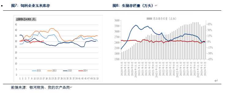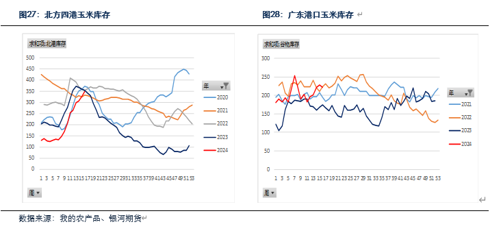 24年4月USDA报告变化不大,美玉米处于种植期,美玉米长时间处于成本线以下,且净空持仓维持高位,5月后容易炒作天气,07美玉米440支撑较强,后面上涨概率较大。全国售粮进度低于去年,但售粮加快,南北方港口库存上升到高位,饲料企业库存也在上升,但渠道库存仍偏低。小麦和玉米价差较高,糙米等替代品数量会大幅减少,玉米在饲料中添加比例会继续上升,5月养殖继续好转,饲料需求仍会增加。5月玉米现货会企稳上涨,华北玉米反弹空间相对较大,东北与华北玉米价差会拉大。