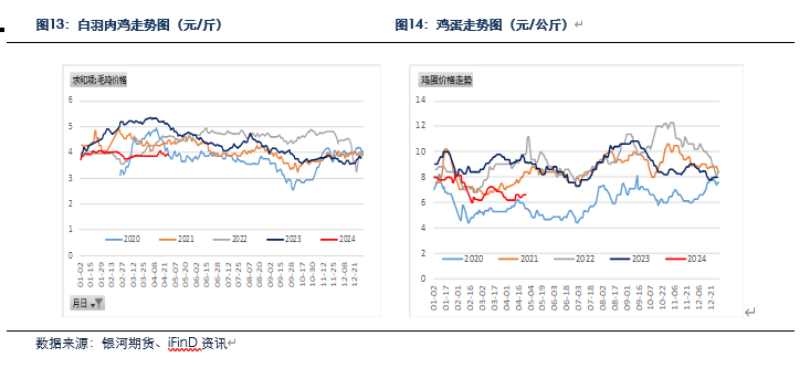 根据中国饲料工业协会数据,2024年1-2月饲料产量4437万吨,同比下降3.6%,玉米用量占比41.1%。2024年4月养殖行业延续弱势,生猪存栏继续去化,肉禽和蛋禽利润下滑,价格也在下跌。根据钢联数据,123家样本企业能繁母猪3月存栏481.57万头,环比涨0.11%,同比减少5.57%。商品猪3月存栏3333.75万头,环比上涨0.79%,同比下降1.07%。截止4月24日,自繁自养利润为119元/头,外购仔猪利润303元/头。白羽肉鸡由于下游鸡产品走货偏慢,但价格开始企稳上涨,养殖利润也在上涨。截止4月21日,鸡蛋养殖成本3.6元/斤,养殖利润-0.25元/斤,白羽肉鸡养殖利润0.24元/只。
