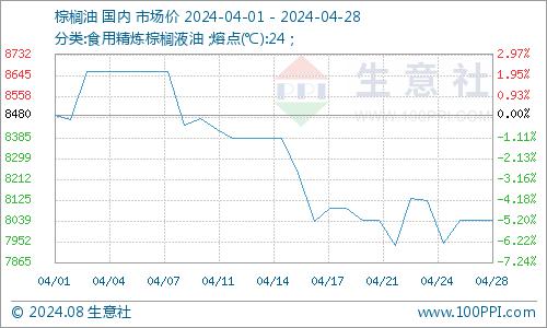 据生意社商品行情分析系统监测,本周棕榈油酸平稳运行,截至4月28日国内棕榈油酸(纯度≥70)主流价格在11466.67元/吨,价格较上周持平,较4月1日上涨0.29%。