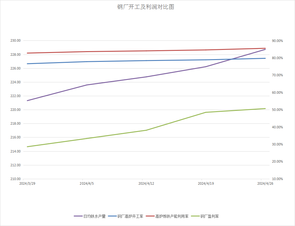 需求方面,4月钢厂高炉开工情况好转,钢厂利润逐步恢复,铁水产量也逐渐增长。与此同时,下游钢材成交情况也在持续好转,所以5月钢厂减产概率较小;而从去年的铁水产量增长情况以及钢厂利润情况来看,节后铁水产量仍会有保持增长,利好铁矿需求释放,但具体增加情况还要看钢厂利润情况以及下游钢材成交情况。