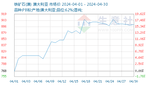 4月以来,铁矿行情先是高位震荡,节后冲高回落,整体偏弱走势,据生意社铁矿追踪价格显示,截至30日生意社铁矿价格指数为893.33,环比上涨16.18%,其中,在25日达到月内最高点为906,涨幅度达到17.83%,具体如上图。
