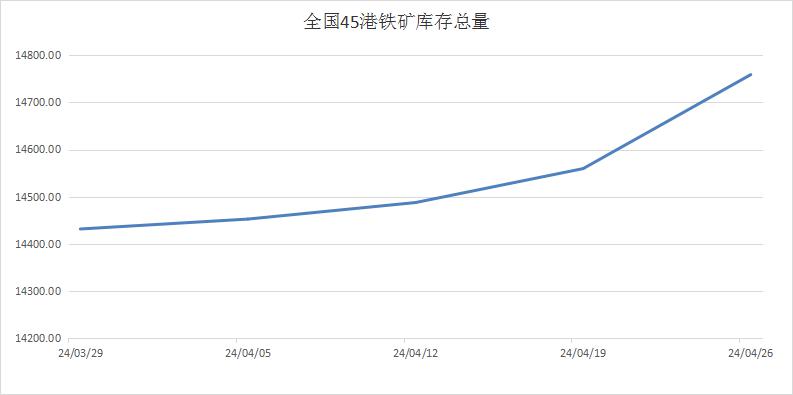 库存方面,截至4月26日,全国45个港口进口铁矿库存为14759.11万吨,月环比增加327.91万吨;日均疏港量为300.96万吨,月环比增加10.72万吨;在港船舶数101条,与3月底相比增加5条。本周铁矿港口库存情况如上图;全国钢厂进口铁矿库存总量为9379.93万吨,月环比增加231.07吨。4月随着钢厂利润好转,开工积极性改善,从而引发提货需求,所以日疏港量增长,不过海外发运积极,所以港口库存依然维持累增趋势,加上五一假期在即港口提货情况会有所放缓。现阶段钢铁后续行情还是要看下游钢材成交情况,如果钢材成交量好转,会进一步刺激钢厂开工规模从而利好铁矿需求释放。上周随着澳洲天气影响消退,海外发运大幅回增,节后港口库存维持累库趋势,5月铁矿港口库存量维持高位运行。