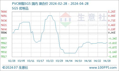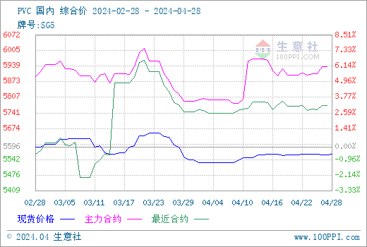 本周PVC现货市场震荡运行。临近五一假期场内交投情况略显一般,市场价格小幅波动,厂家报价基本稳定,贸易商价格相对灵活。下游采购较为谨慎,观望情绪浓厚,节前备货积极性一般,仍以刚需为主。截至目前,国内PVC SG5型电石料报价范围多在5520-5750元/吨附近。