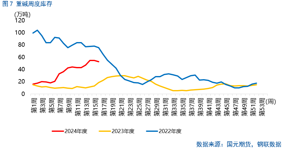 虽然下游库存整体情况较高,但部分企业库存不高,叠加纯碱以涨促销、发货紧张,部分企业仍存一定补库需求,市场情绪尚未退温。截至4月19日,国内纯碱厂商总库存为89.09万吨,环比减少2.16万吨,环比减少2.37%。其中,轻碱库存为36.32万吨,环比减少0.23万吨,环比减少0.63%,重碱库存为52.77万吨,环比减少1.93万吨,环比减少3.53%。