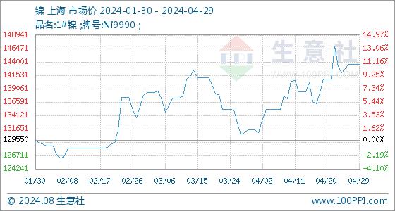 4月29日,生意社镍基准价为143583.33元/吨,与本月初(131466.67元/吨)相比,上涨了9.22%。