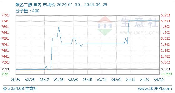 4月29日,生意社聚乙二醇基准价为7750.00元/吨,与本月初(7550.00元/吨)相比,上涨了2.65%。