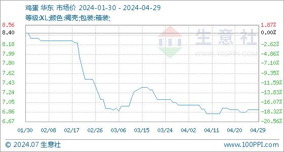4月29日,生意社鸡蛋基准价为6.91元/公斤,与本月初(7.00元/公斤)相比,下降了-1.29%。