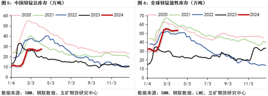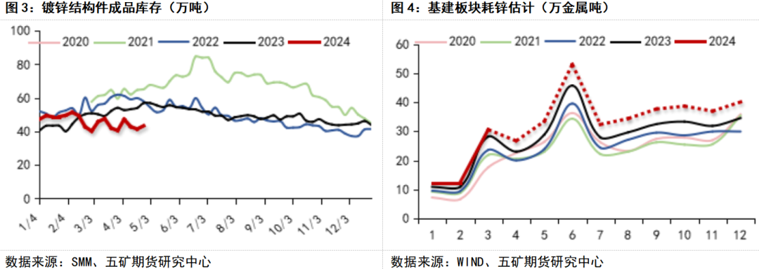 终端需求来看,2024年房地产需求数据仍然偏差。但基建、汽车、家电和光伏板块在24年耗锌的增量预计将会很大程度上覆盖地产的耗锌缺口。一方面,电网基础设施智能化改造和智能微电网建设基建提上日程,基建板块中电网投资需求预计大幅增加,锌主要消费终端进一步由地产板块向基建板块转移。另一方面汽车家电板块以旧换新的政策刺激和光伏板块的蓬勃发展,预计将为锌锭消费注入新增速。预计2024年全年地产用锌减少至170万吨左右,基建用锌增加至390万吨左右,汽车家电光伏板块累计耗锌增加至95万吨左右。